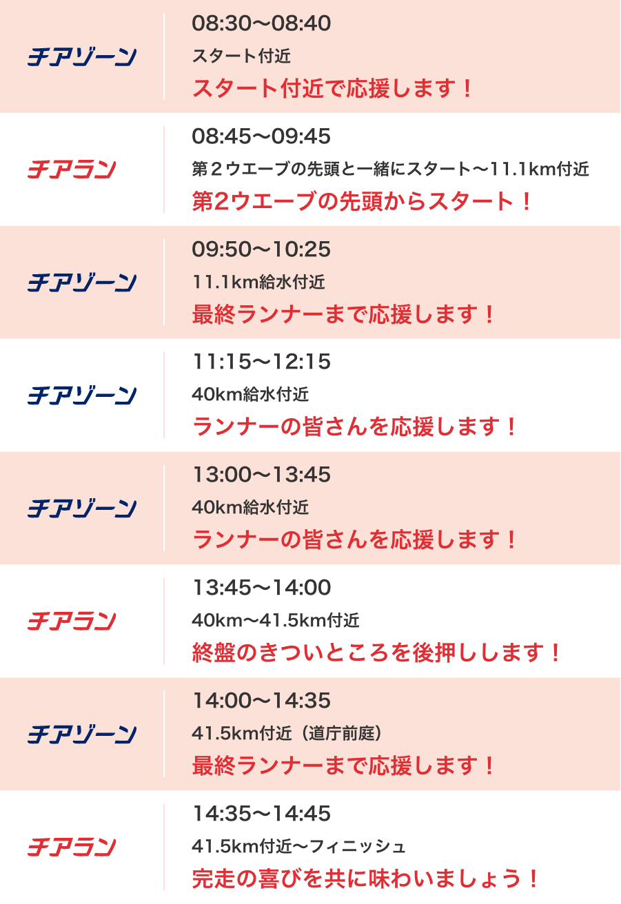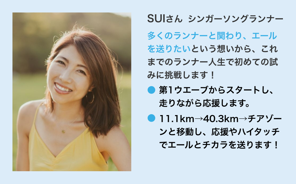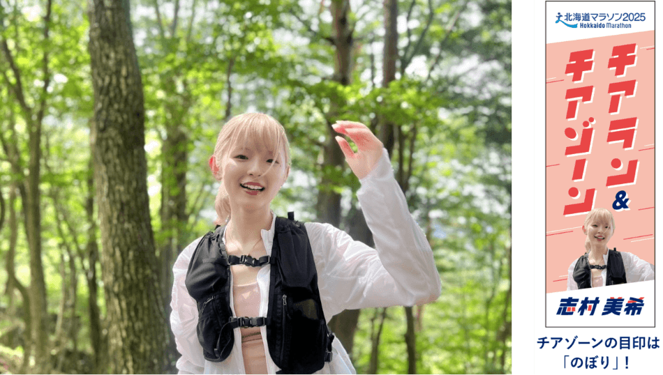 志村美希さんによるランナー応援プロジェクトが実現!ランナーと一緒に、元気に楽しく走る「チアラン」。コース上のポイントで皆さんを応援し、背中を後押しする「チアゾーン」。ミキティーの応援をチカラに変えて、完走を目指して駆け抜けましょう!