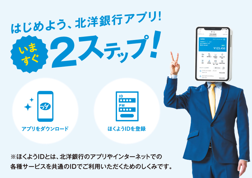 銀行取引が24時間いつでも可能な「北洋銀行アプリ」のご案内です。