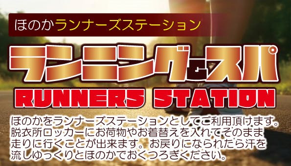 ほのかランナーズステーションはお荷物やお着替えを入れてそのまま走りに行くことが出来ます。 戻られましたら汗を流しゆっくりとほのかでおくつろぎください。 ご利用方法や注意事項につきましては、ランナーズステーション実施店舗のURLよりご確認ください。