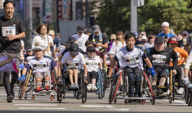 2015大会から「はまなす車いすマラソン」と合同開催、2018大会に「視覚障がい者の部」を設けました。2024大会では「オープンの部」を新設し、順位を競うことを望まない方や性別、年齢による比較枠を望まない方を受け入れる取り組みを継続します。