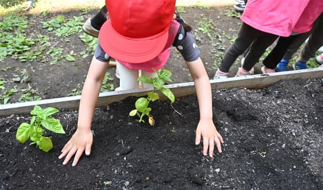 SDGs農園は北海道大学総合博物館の中庭に設置されています。北大札幌キャンパスで回収された落ち葉からできた腐葉土を利活用。農園の造成と管理は北大教職員や北海道マラソン事務局、学生を主体とした北大総合博物館のボランティアグループ「きたみてガーデン」が行っています。食育の機会提供の場として、保育園児が栽培体験もしています。