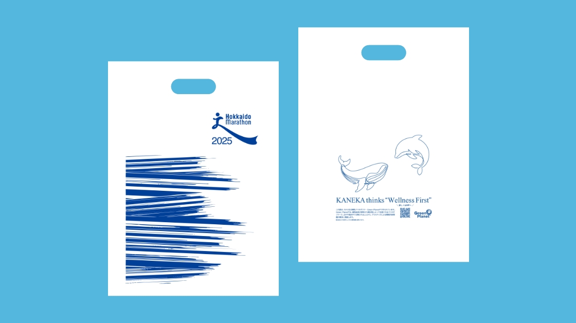 大会前々日、前日のアスリートビブスをお渡しする際に配付するランナー受付袋は、100%植物由来の海水中でも生分解されるカネカ提供の「カネカ生分解性バイオポリマー Green Planet®」で作られています。