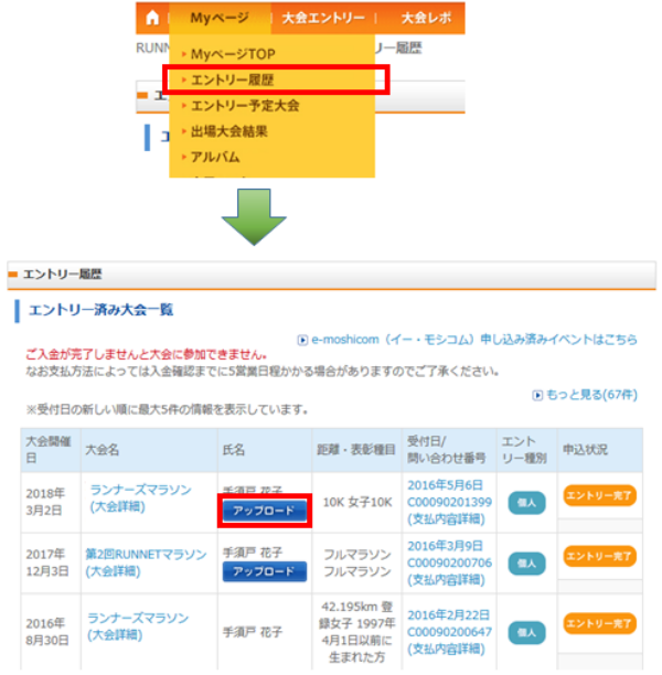 - 「エントリー済み大会一覧」から「北海道マラソン2025」の氏名下にある「アップロード」ボタンをクリック。